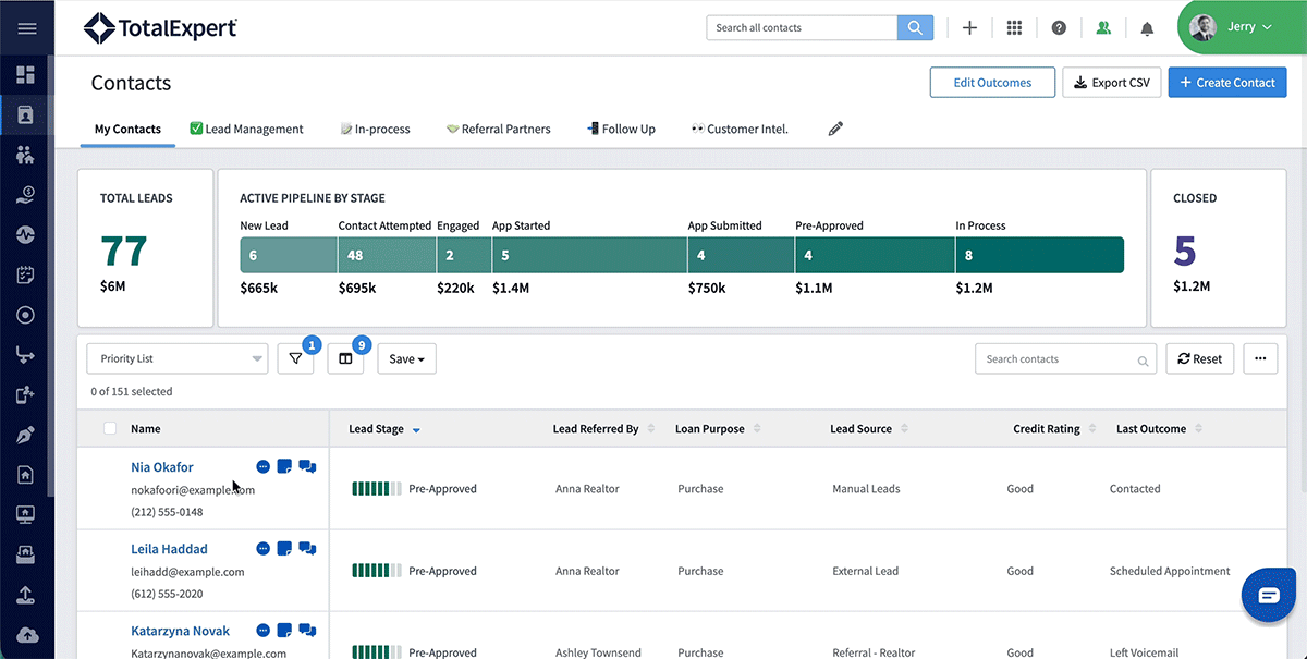 - Flyout Panel: A new details panel opens directly from Pipeline Views when a user selects a contact, surfacing all of that contact’s lead opportunities without navigating away from the list. The panel displays key lead information including lead stage, purpose, loan amount, qualification details, and loan details, and allows users to update lead stage, log an outcome, add a note, create a new lead, or delete an existing lead without leaving their current list. The panel updates in real time after any action and stays open as users click between contacts, making it significantly faster to triage and work large lead lists.