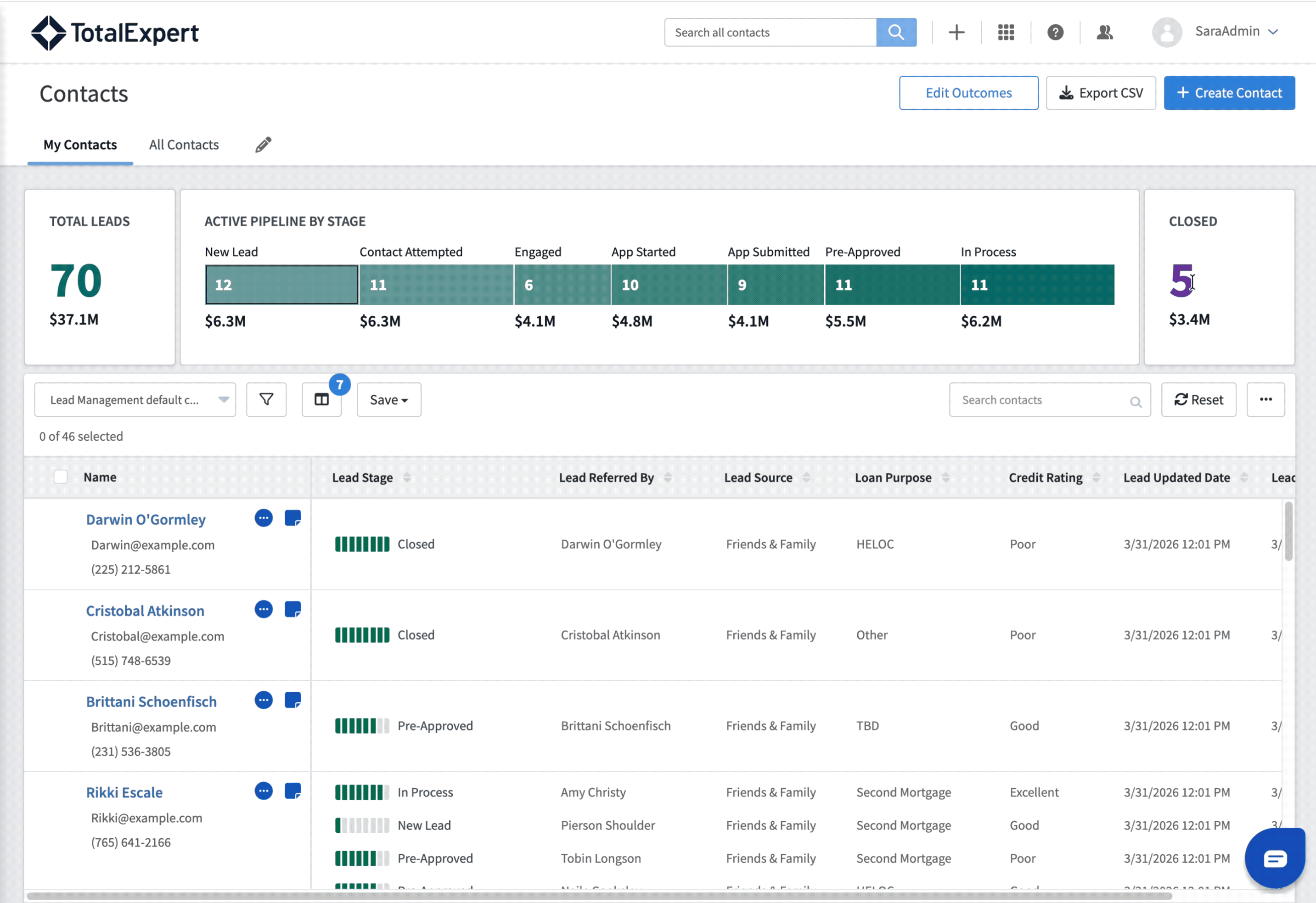 - Outcome-based Lead Stage updates: Admins can now map their organization’s existing outcomes to specific Lead Management lead stages. When a loan officer logs an outcome on a lead, the system automatically advances the lead to the corresponding stage — no manual stage update required. The stage change happens in real time across Pipeline Views, the flyout panel, and Contact Details, and is recorded in the contact’s Activity tab. If an outcome is logged without being linked to a lead, no stage change occurs. Lead stages can only be advanced through outcome selection, not regressed.