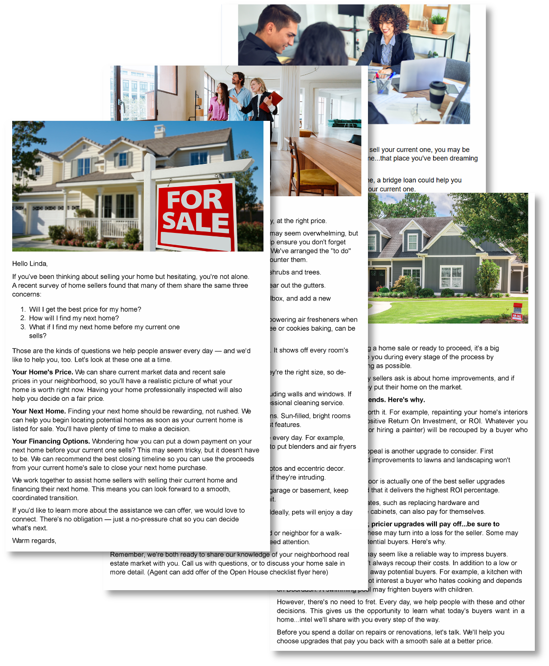 - Seller’s Education Marketing Package: A short email series for potential home sellers covering topics such as which upgrades deliver the best ROI, how to prepare for an open house, and more. Includes print and social content, plus an optional Bridge Loan email.